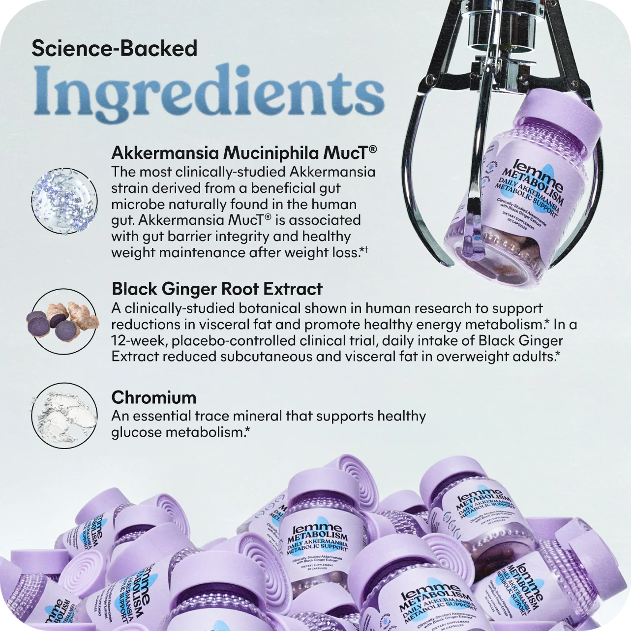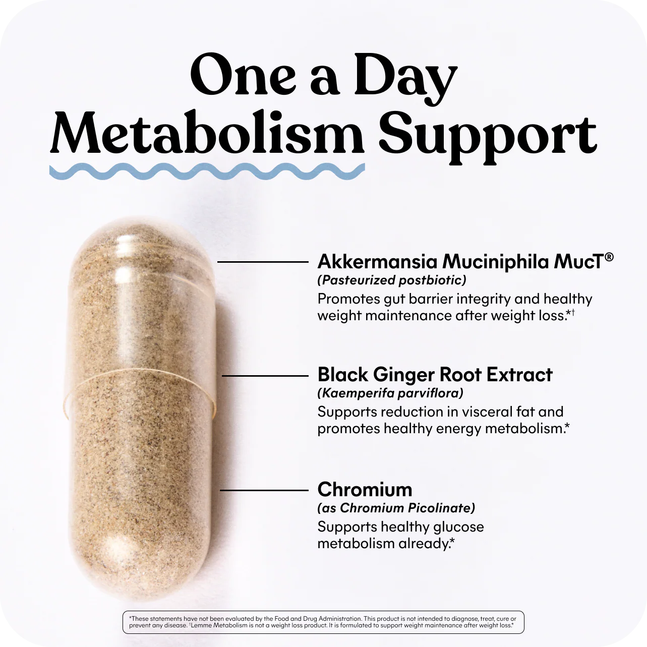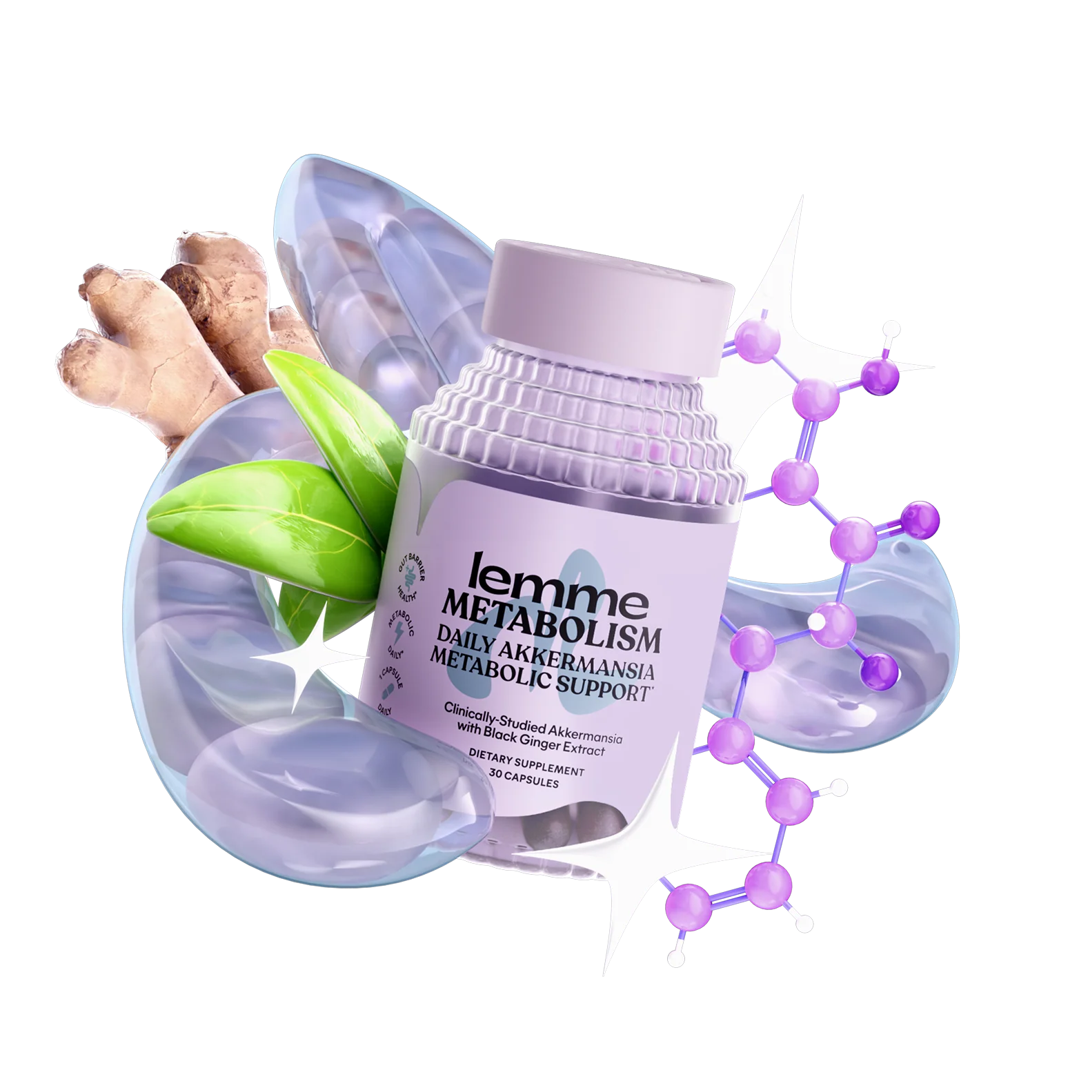 Powered by clinically-studied Akkermansia muciniphila MucT® and Black Ginger Root Extract, Lemme Metabolism delivers next-generation metabolism and gut barrier support in just one daily capsule.*